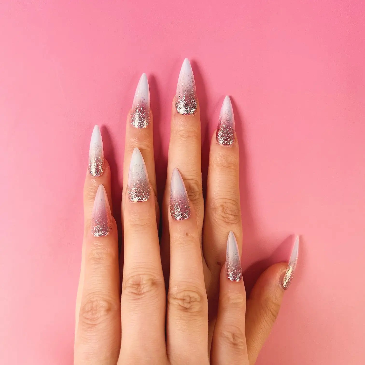 COLOR: PINK AND WHITE GRADIENT| DESIGN: METALLIC SEQUINS | FINISH: GLOSSY | LENGTH: LONG | BEST SELLERS | STYLE:HOTTIE | SHAPE: STILETTO | MATERIAL: ACRYLIC |