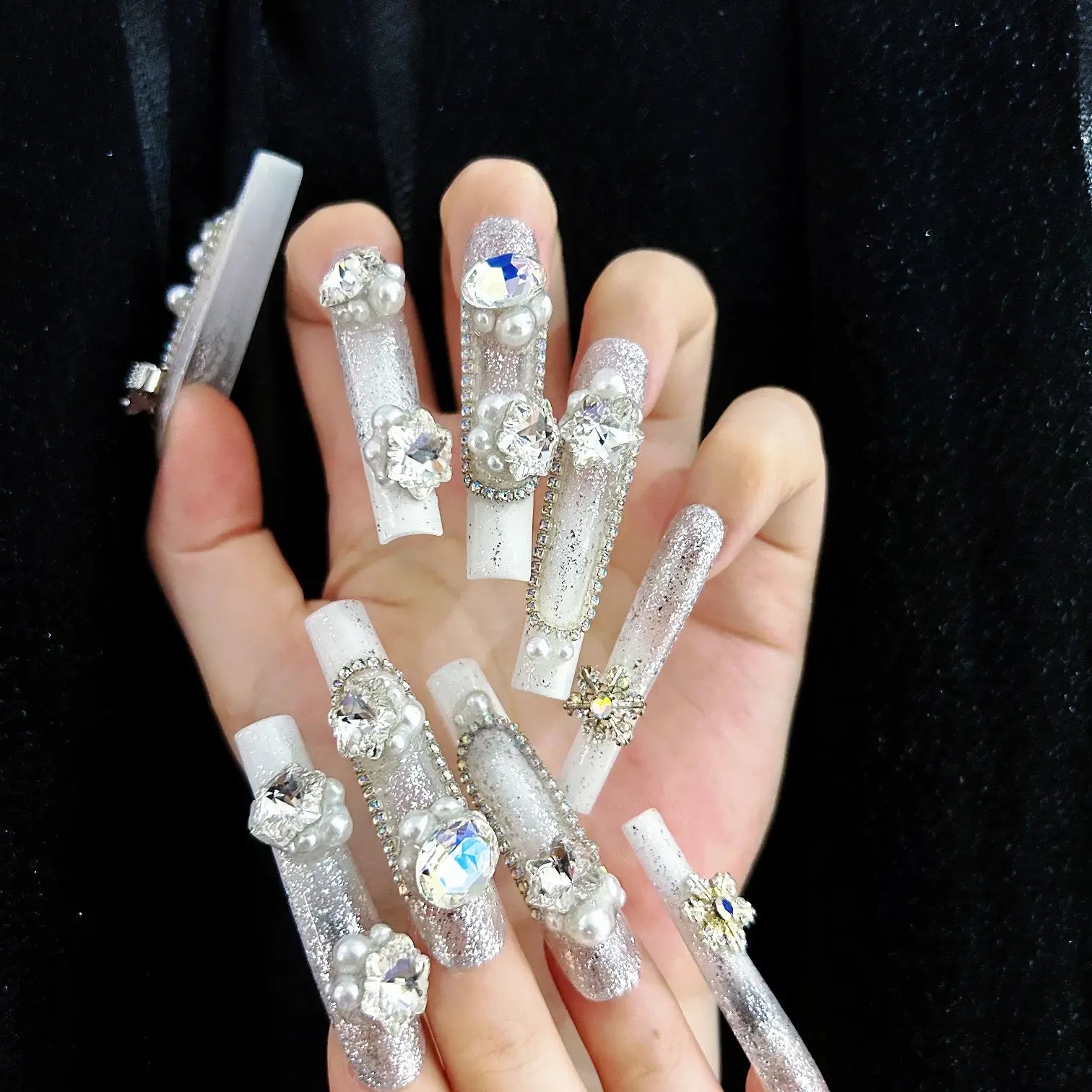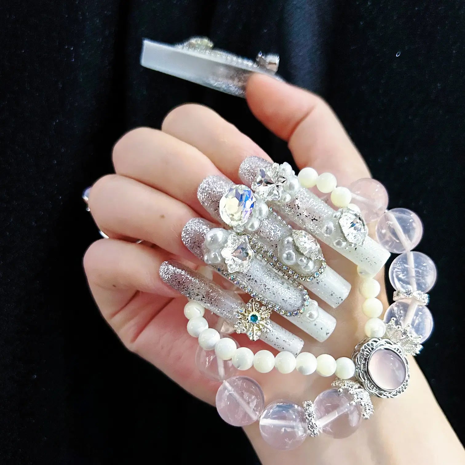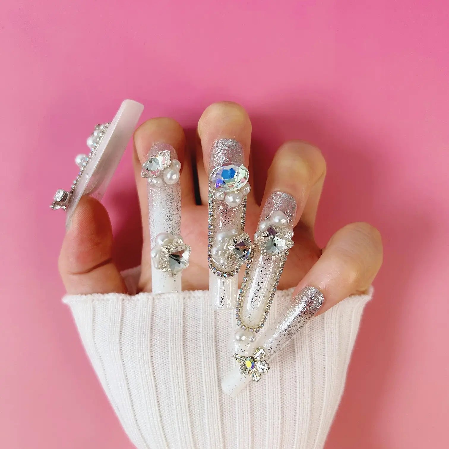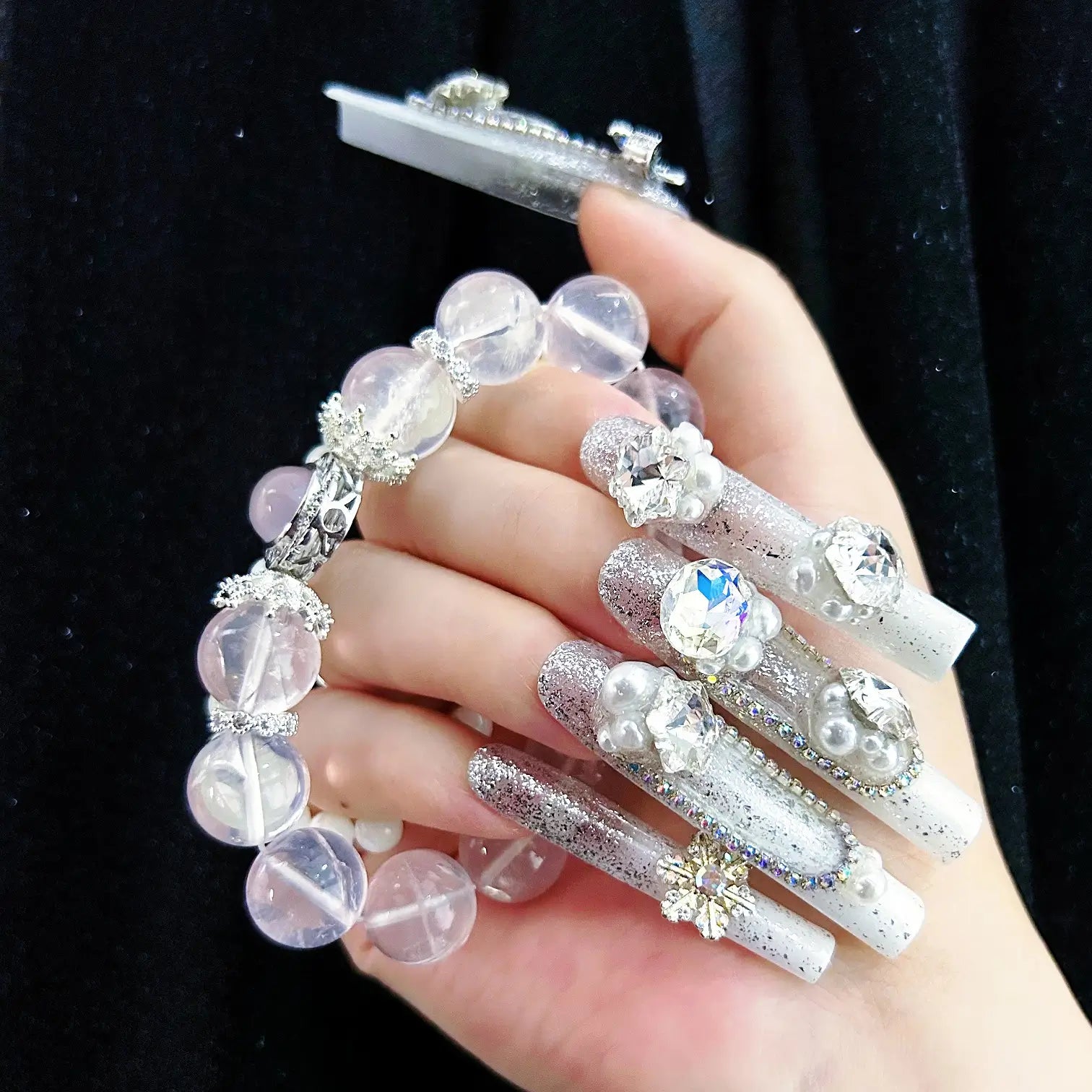 COLOR: WHITE & SILVER | DESIGN: BUTTERFLY BOW, SYNTHETIC RESIN DIAMOND, FRESHWATER PEARL| FINISH: GLOSSY | LENGTH: EXTRA LONG | BEST SELLERS | STYLE:HOLIDAY LIMITED EDITION | LIMITED EDITION | SHAPE: SQUARE
