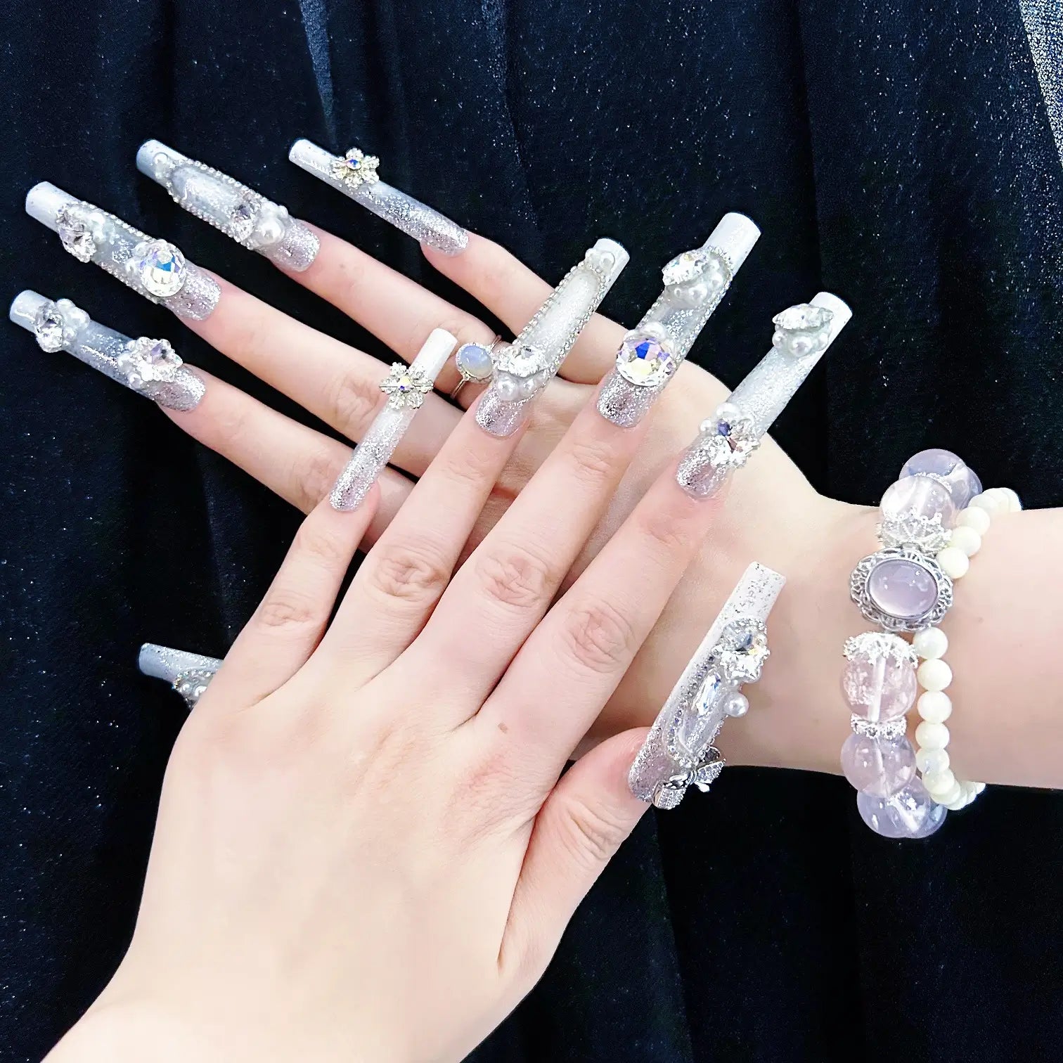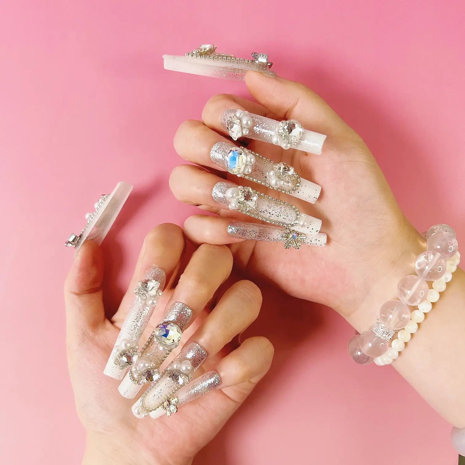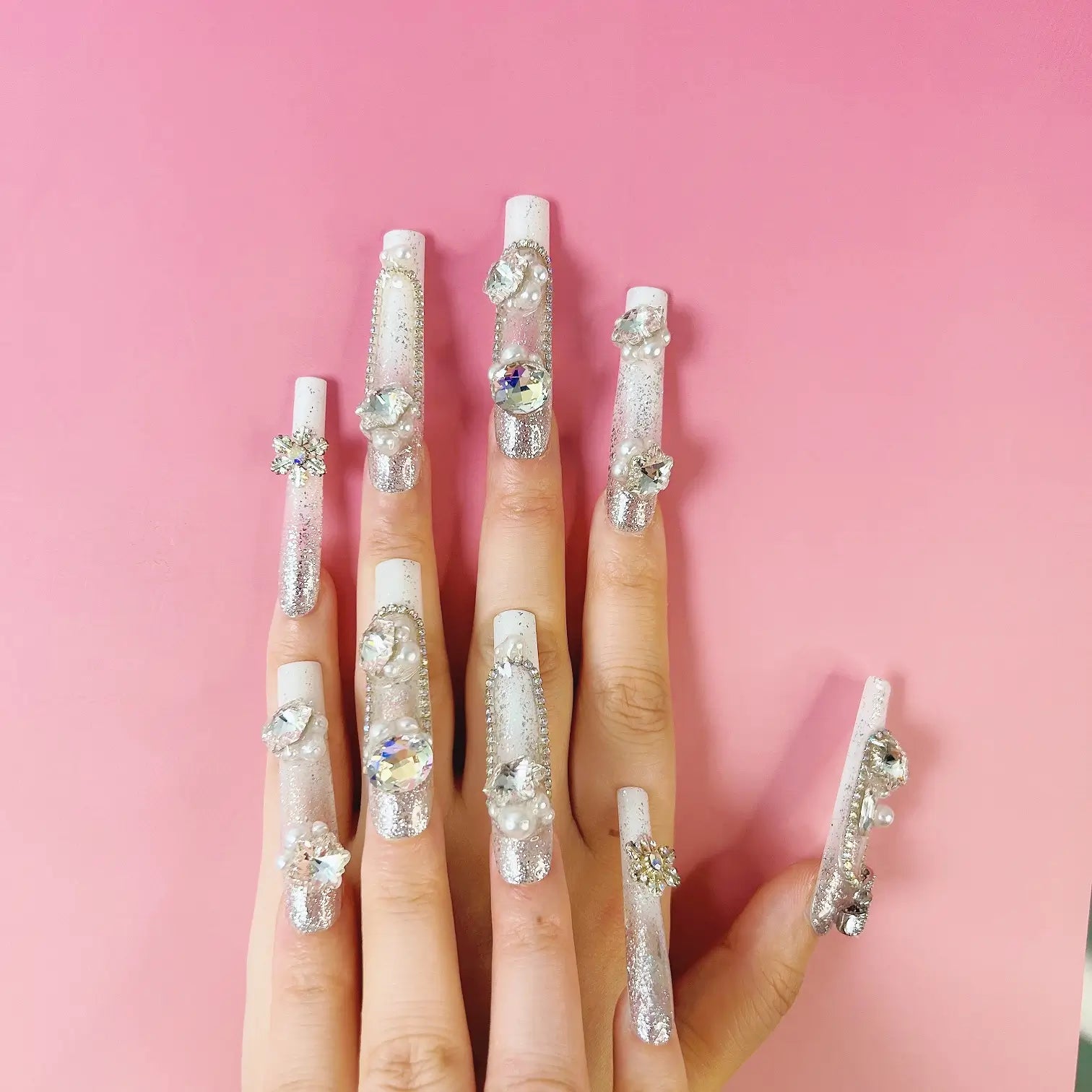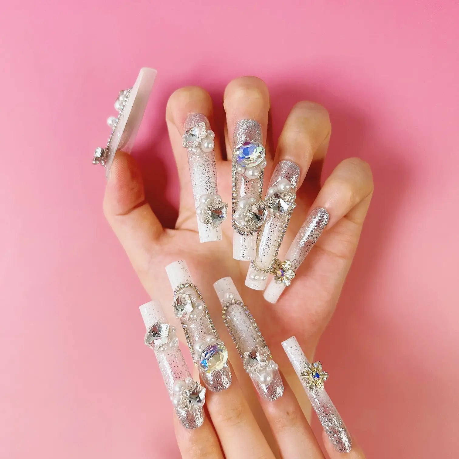 COLOR: WHITE & SILVER | DESIGN: BUTTERFLY BOW, SYNTHETIC RESIN DIAMOND, FRESHWATER PEARL| FINISH: GLOSSY | LENGTH: EXTRA LONG | BEST SELLERS | STYLE:HOLIDAY LIMITED EDITION | LIMITED EDITION | SHAPE: SQUARE