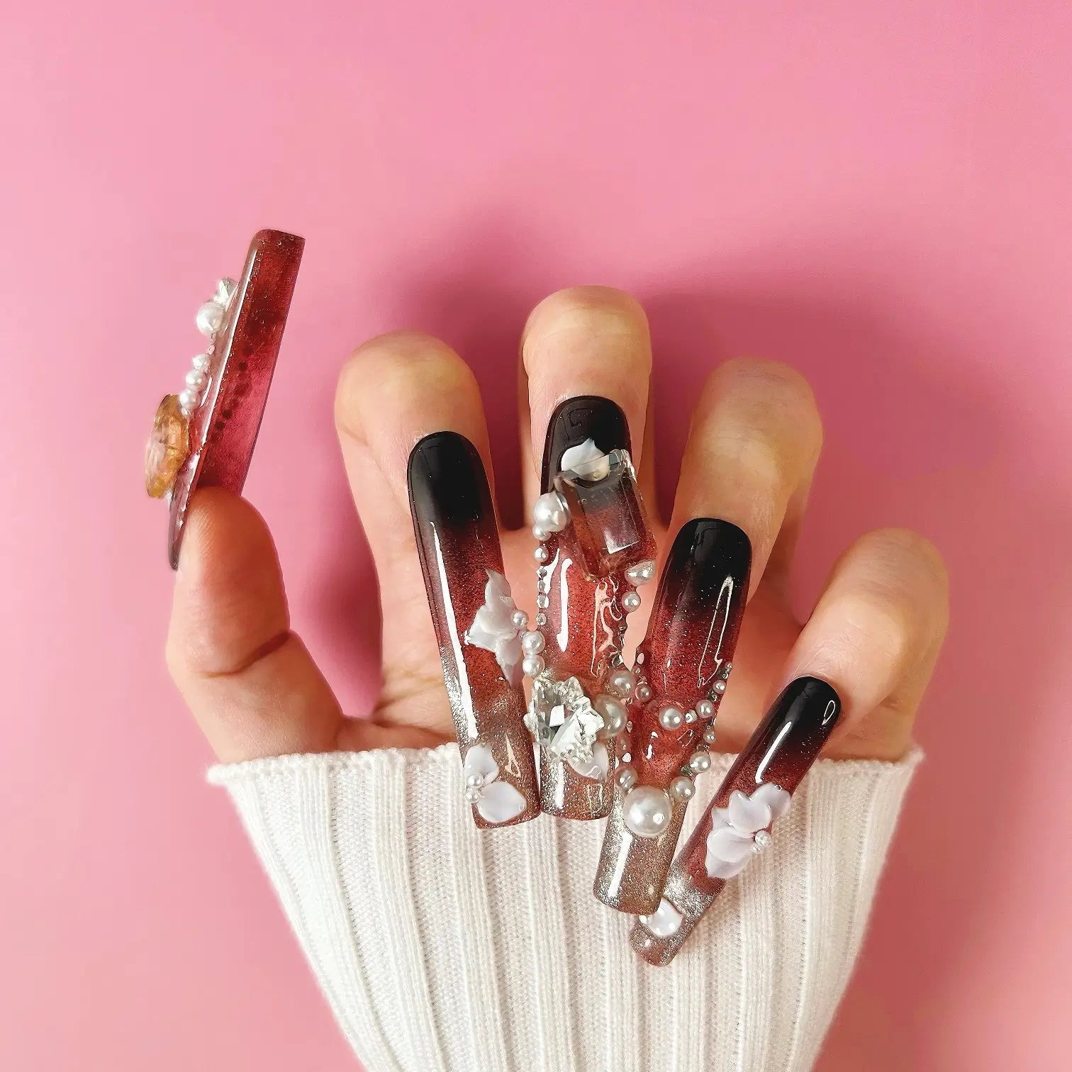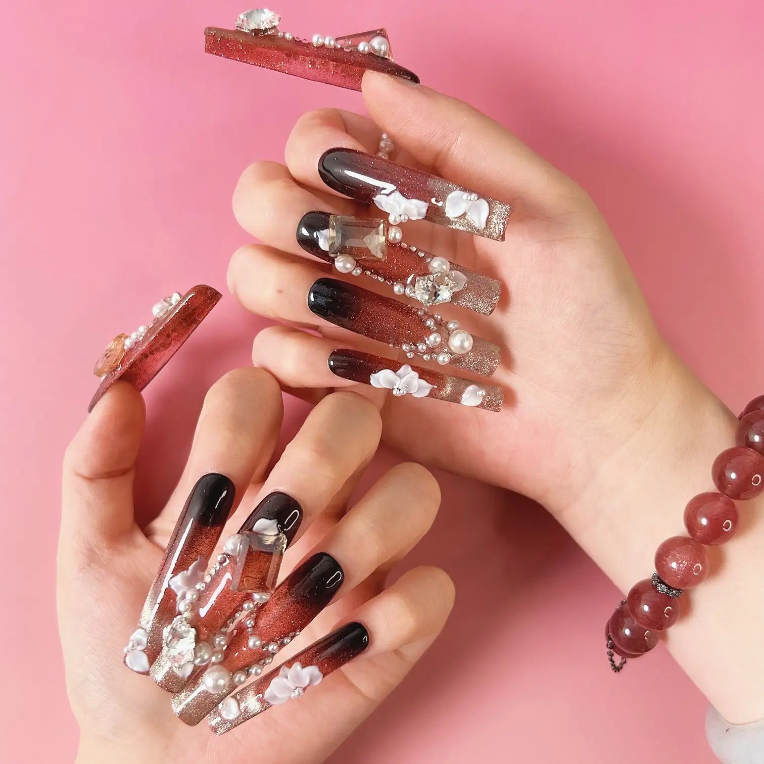 COLOR: BLACK & DARK RED-SILVER GRADIENT| DESIGN: SYNTHETIC RESIN DIAMOND,| FINISH: GLOSSY | LENGTH: EXTRA LONG | BEST SELLERS | STYLE:HOTTIE | LIMITED EDITION | SHAPE: SQUARE
