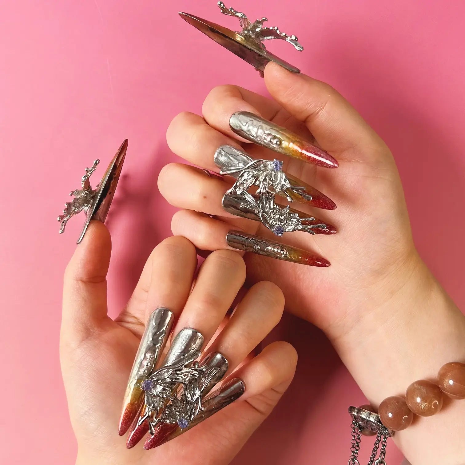COLOR: SILVER & ORANGE-YELLOW GRADIENT| DESIGN: BUTTERFLY SYNTHETIC RESIN DIAMOND | FINISH: GLOSSY | LENGTH: EXTRA LONG | BEST SELLERS | STYLE:HOTTIE | LIMITED EDITION | SHAPE: STILETTO