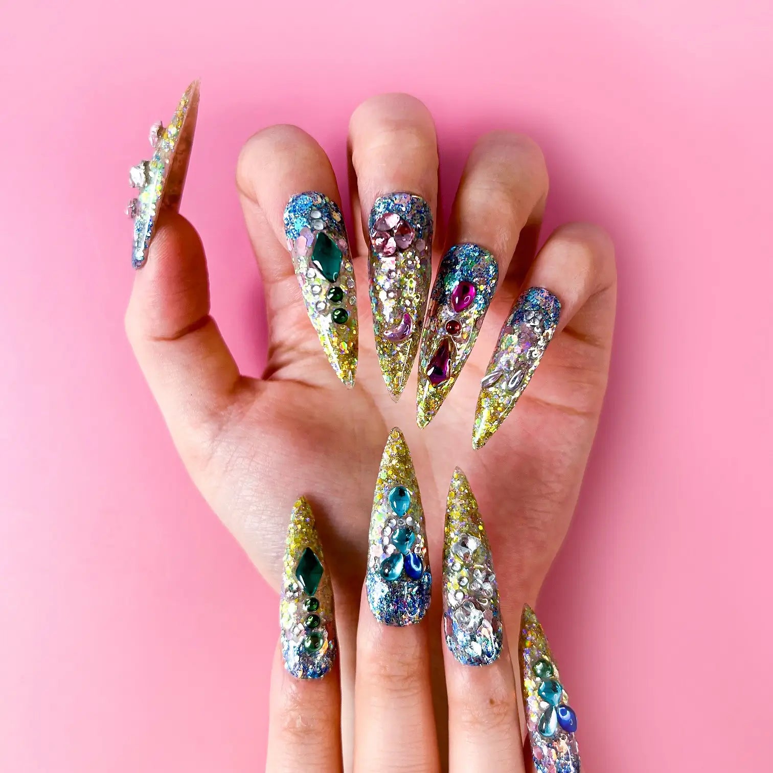 COLOR: BLUE & PURPLE & YELLOW COLOR GRADIENT | DESIGN: DREAMY RAINBOW GEMSTONE SPARKLE | FINISH: GLOSSY | LENGTH: EXTRA LONG | BEST SELLERS | STYLE:HOTTIE | LIMITED EDITION | SHAPE: STILETTO