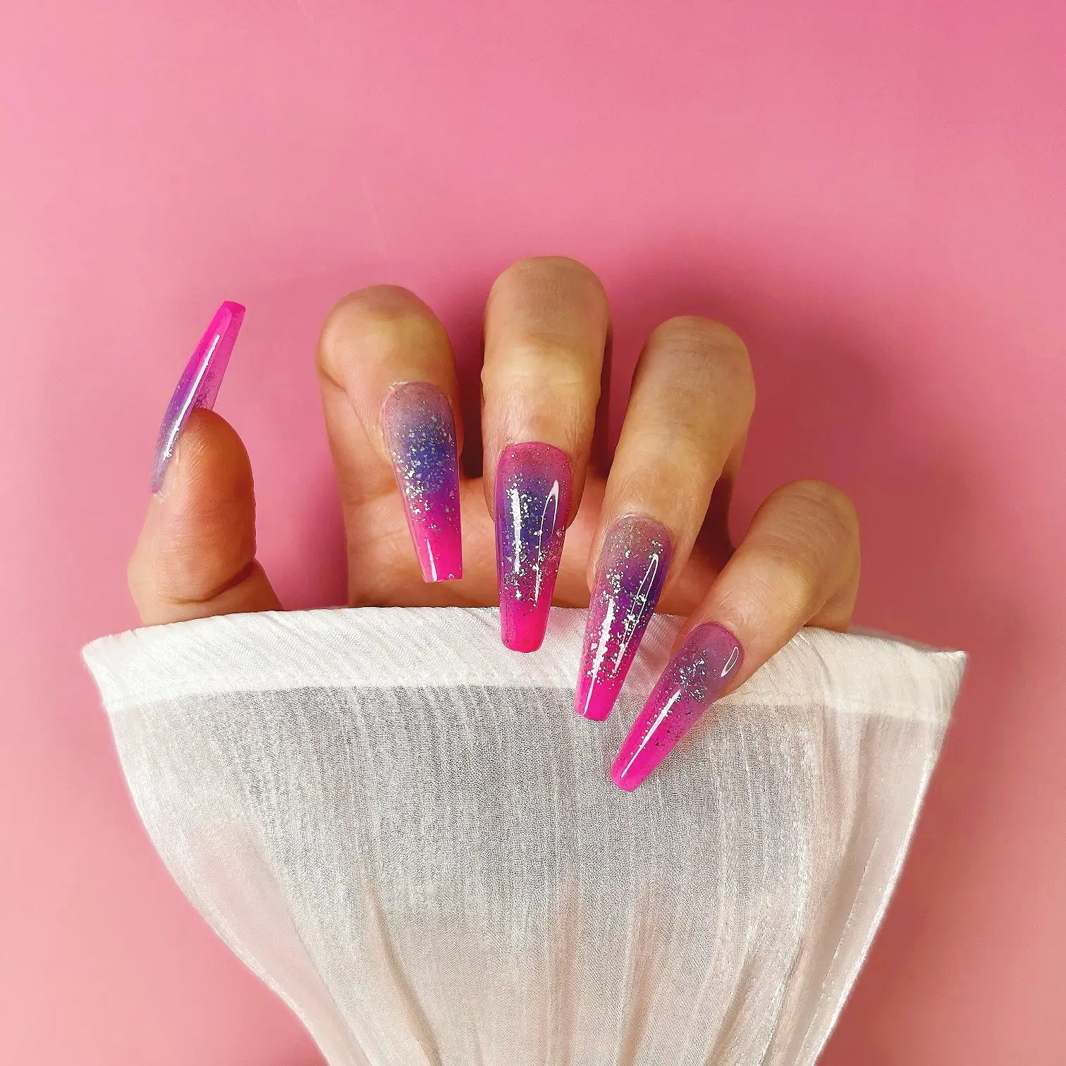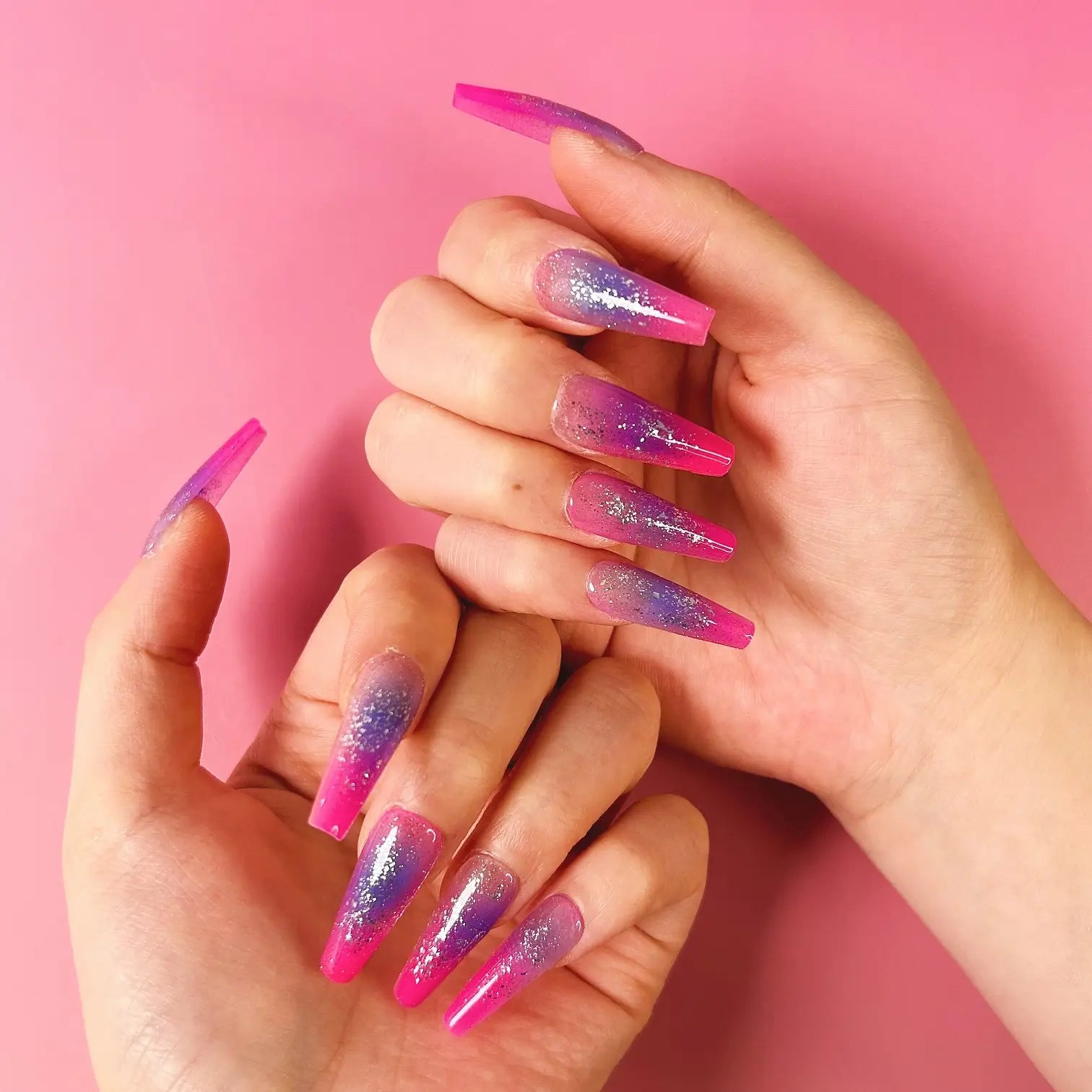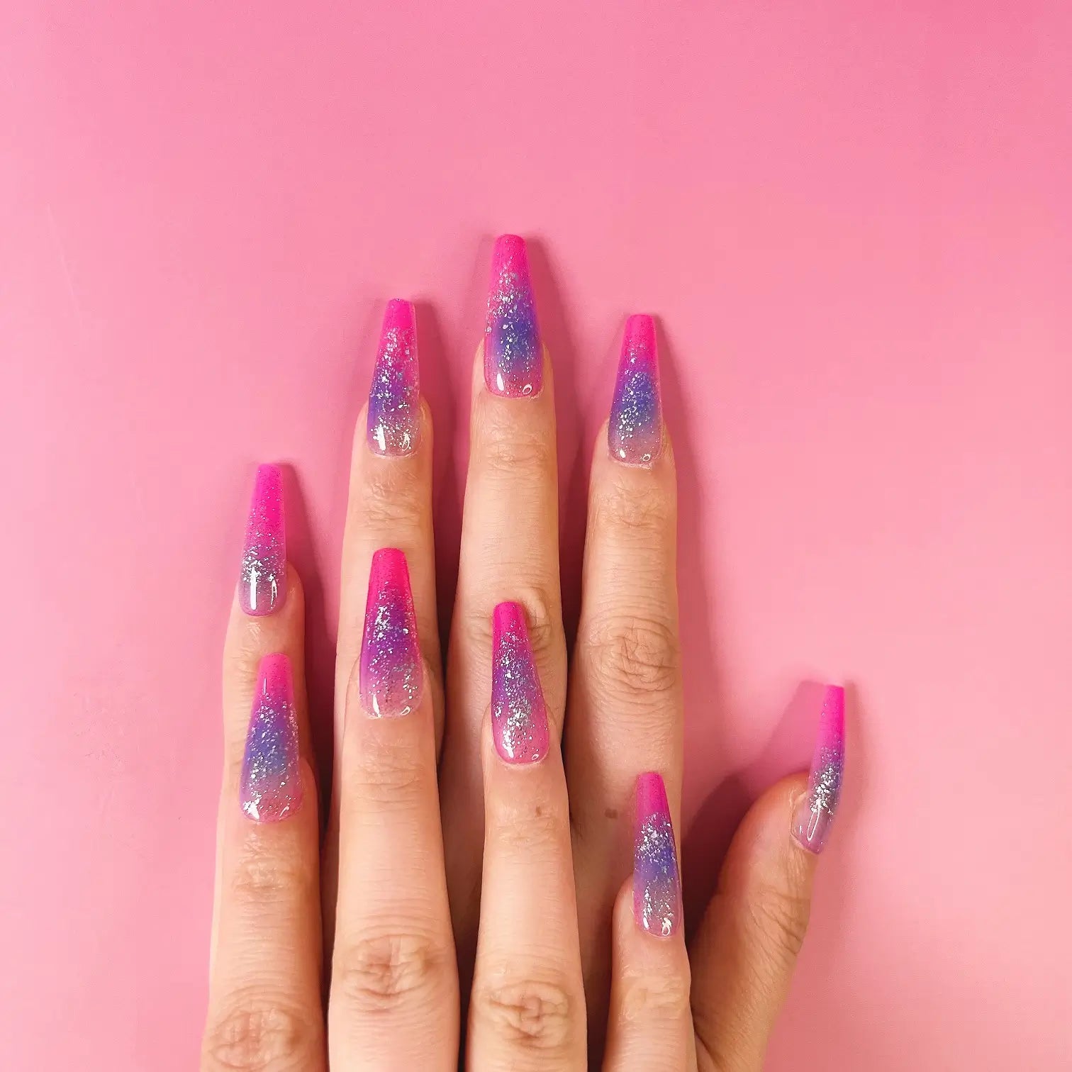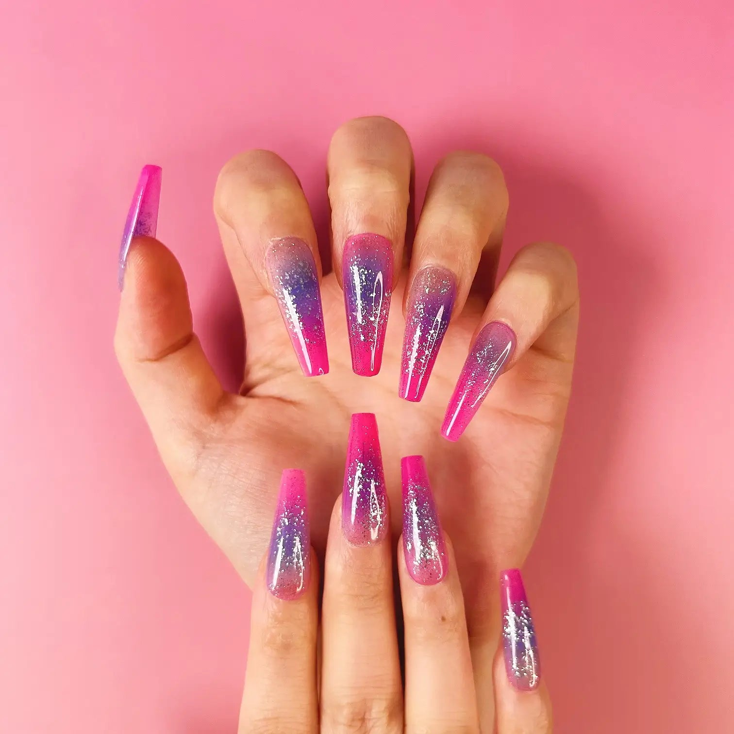 COLOR: MAGENTA TO PURPLE GRADIENT | DESIGN: SILVER GLITTER| FINISH: GLOSSY | LENGTH: EXTRA LONG | BEST SELLERS | STYLE:HOTTIE | SHAPE:COFFIN